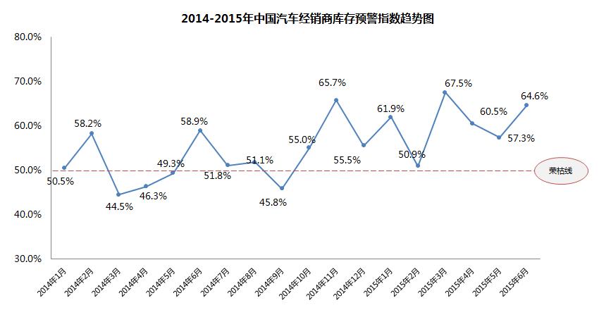 2015年6月份中国汽车经销商库存预警指数为64.6%