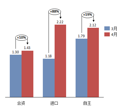 3月份市场逐周走强,符合了厂商和经销商的预期。本月新产品上市较少,主要依靠市场营销活动的大力展开增加了销量。继一、二月连续2个月经销商库存大幅度增加,使3月成为消化库存的重要月份。另外大城市恐慌购车的风潮越演越烈,如杭州限购当就收到了7万辆的订单也成为三月销量增长的因素之一。