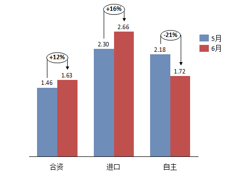 6月份,合资、进口、自主品牌库存系数均有一定幅度下降,合资品牌库存系数由上月1.46升至1.63;自主品牌库存系数由上月的2.18降至1.72; 进口品牌库存系数由上月的2.30升至2.66。本月,合资、自主、进口品牌均处于较高库存水平,经销商库存压力加大。