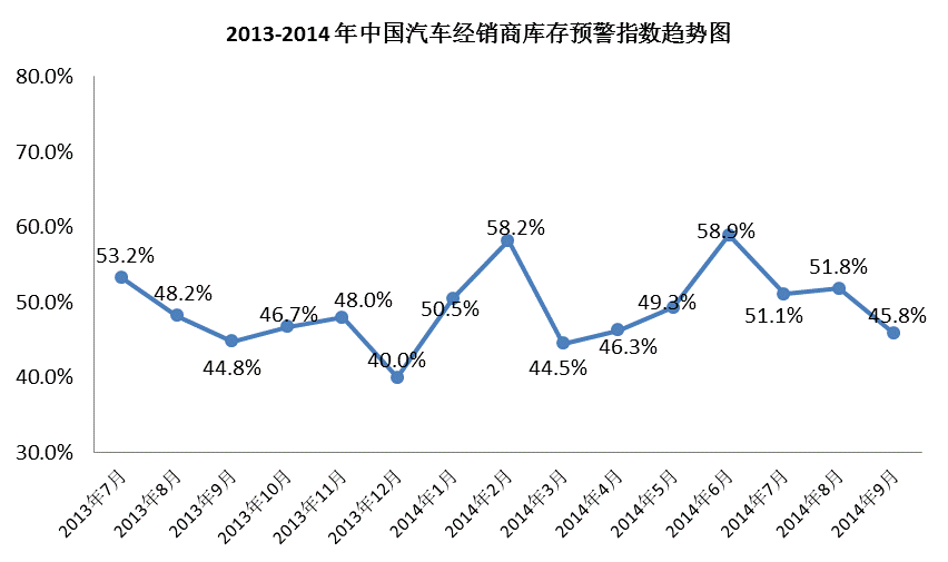 中国汽车流通协会发布的“中国汽车经销商库存预警指数调查”VIA(Vehicle Inventory Alert Index)显示,2014年9月库存预警指数为45.8%,比上月下降了6个百分点。