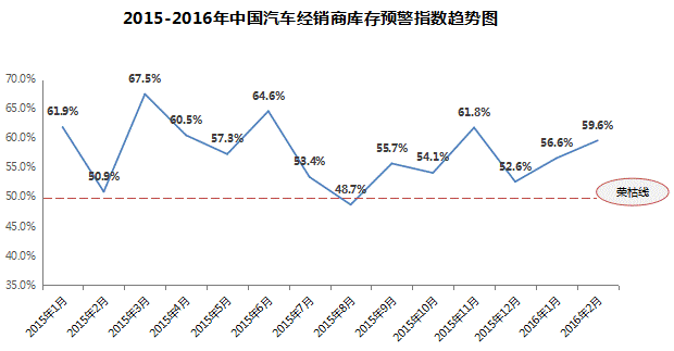 中国汽车流通协会发布的“中国汽车经销商库存预警指数调查”VIA(Vehicle Inventory Alert Index)显示,2016年2月库存预警指数为59.6%,比上月上升了3.0个百分点。库存预警指数处于警戒线以上。