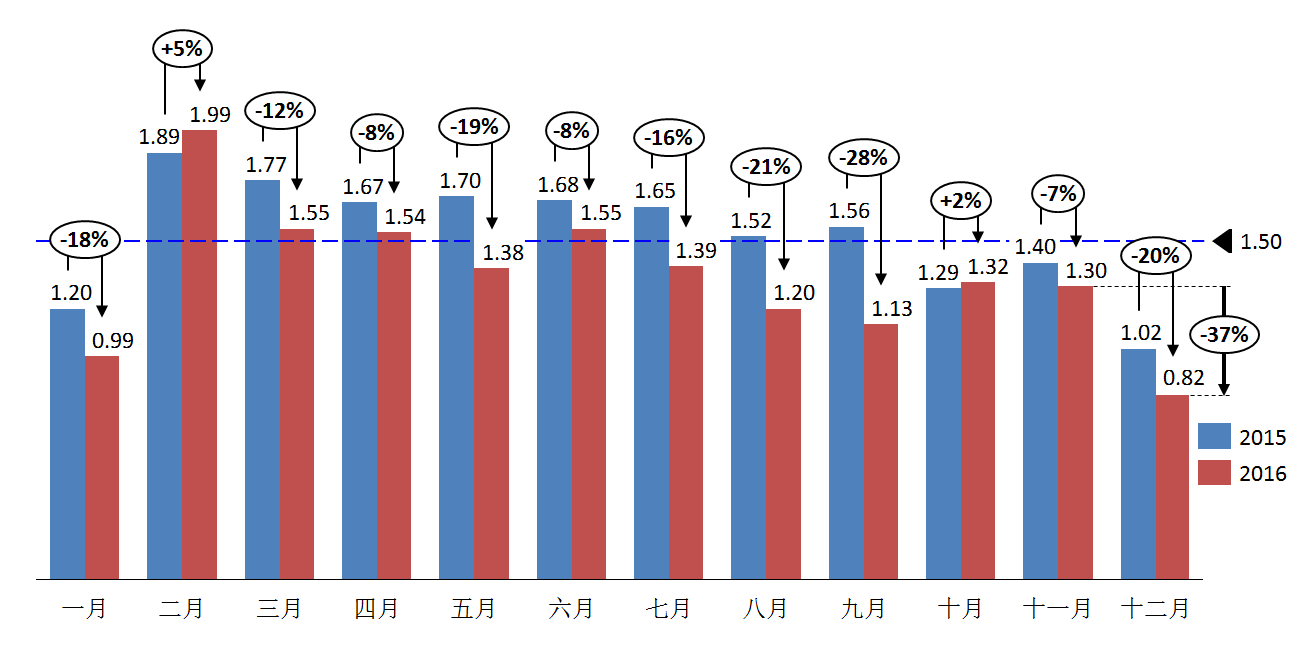 2017年1月18日,中国汽车流通协会对外发布2016年12月份“汽车经销商库存调查结果”。12月份汽车经销商综合库存系数为0.82,环比下降37%, 同比下降20%,经销商库存水平回落至合理区间(见图1)。