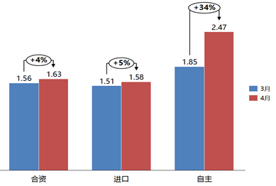 4月份,合资品牌、进口品牌和自主品牌的库存系数相比上月均有所上升。合资品牌库存系数为1.63,环比上升4%;进口品牌库存系数为1.58,环比上升5%;自主品牌库存系数为2.47,环比上升34%。4月,合资品牌、进口品牌和自主品牌库存水平均位于警戒线以上。