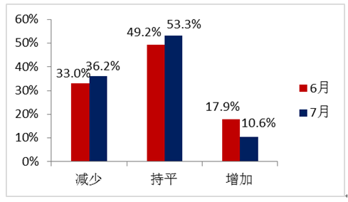 预计7月份市场需求相比上月减少。认为市场需求“增加”的经销商比例为10.6%;认为市场需求“减少”的比例为36.2%;认为市场需求“持平”的比例为53.3%.