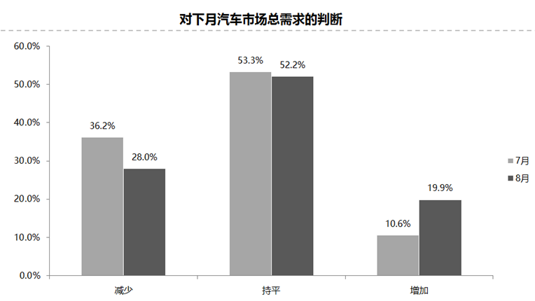 经销商预计8月份市场需求比7月减少,认为市场需求“增加”的经销商比例为19.9%;认为市场需求“减少”的比例为28.0%;认为市场需求“持平”的比例为52.2%。