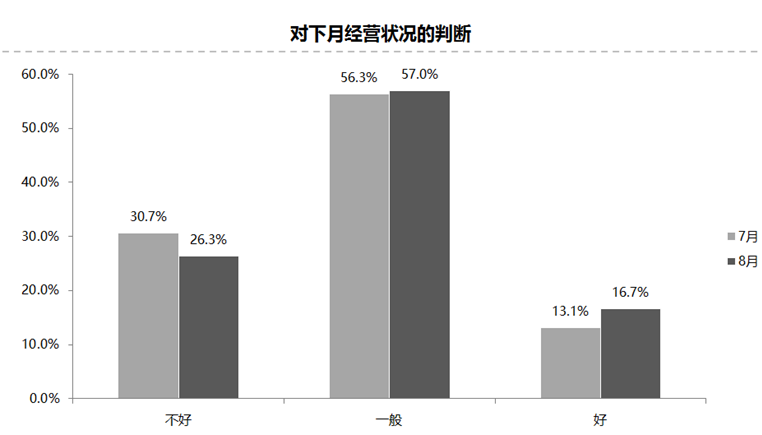 经销商预计8月份经销商经营状况不好。调查显示,认为8月份经营状况“好”的比例为26.3%,认为“不好”的比例为16.7%;认为经营状况“一般”的比例为57.0%。