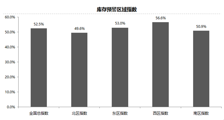 从区域指数情况看:7月份全国总指数为52.5%,北区指数为49.6%,东区指数为53.0%,西区指数为56.6%,南区指数为50.9%。由于北部区域的吉林省、黑龙江省等地区在7月份均有大型国际车展,刺激了当地市场需求,所以,7月北部区域的库存预警指数最低。