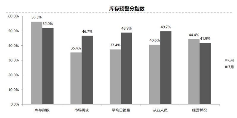 从分指数情况看:7月份库存分指数环比微降,仍位于警戒线以上;市场需求分指数、平均日销量分指数、从业人员分指数环比上升,经营状况分指数环比下降。7月,库存指数为52.0%,市场需求指数为46.7%,平均日销量指数为48.9%,从业人员指数为49.7%,经营状况指数为41.9%。