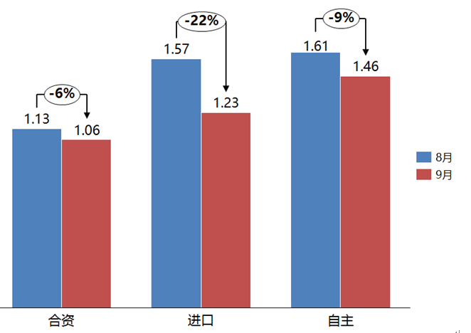 9月份,合资品牌、自主品牌、进口品牌库存系数相比上月下降。合资品牌库存系数为1.06,环比下降6%;自主品牌库存系数为1.46,环比下降9%;进口品牌库存系数为1.23,环比下降22%。9月,经销商的库存压力相比8月有所缓解。