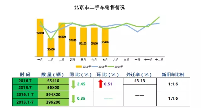 数据显示,7月份京城二手车成交过户55410辆,同比下降2.45%,环比增长0.51%;1-7月京城二手车累计成交过户394820辆次,同比 去年396200辆次累计下降0.35%;二手车超新车销量60.42%,新旧车交易比例1:1.6。北辰亚市信息企划部部长郭咏在分析京城二手车销售情 况时表示,解除限迁对北京二手车市场整体交易迟滞作用依然明显。
