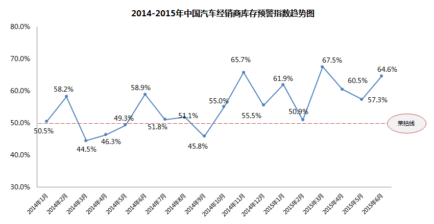 中国汽车流通协会发布的“中国汽车经销商库存预警指数调查”VIA(Vehicle Inventory Alert Index)显示,2015年6月库存预警指数为64.6%,比上月上升了7.3个百分点??獯嬖ぞ甘τ诰湎咭陨希从ζ凳谐⌒枨笫账?,经销商库存和经营压力加大。