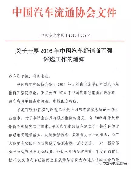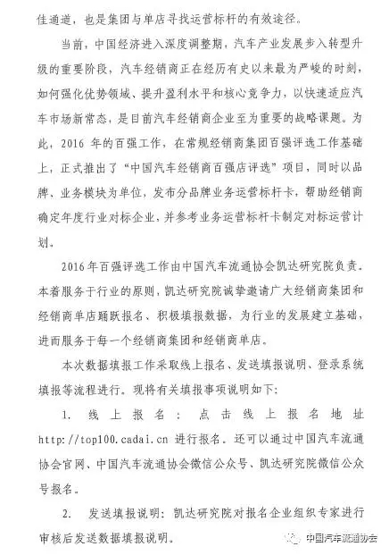 关于开展2016年中国汽车经销商百强评选工作的通知