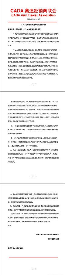 在声明中,经销商提出以下诉求:(一)奥迪公司和一汽-大众奥迪销售事业部应建立合理的商务政策,保障网络渠道健康有序的发展;(二)双方就渠道过剩事宜进行磋商,以2020战略实现100万辆销售目标与580家网络数量匹配为基础,每年按实际销量核算出因网络过剩所造成的损失,并为经销商提供合理的解决方案;(三)奥迪公司和一汽-大众奥迪销售事业部与全体会员签订为期五年的经销商协议,待汽车销售管理办法等法律法规公布后,按照其规定进行续签。