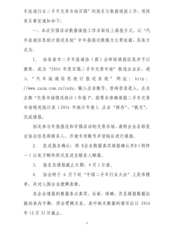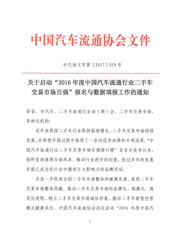 关于“2016年度二手车市场百强”启动的通知
