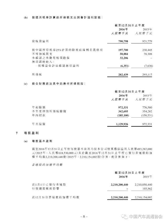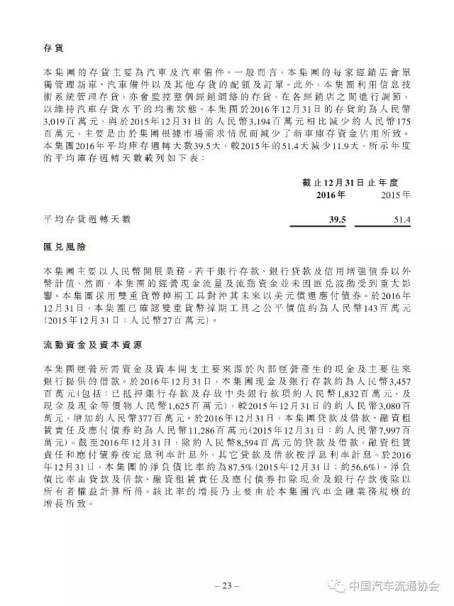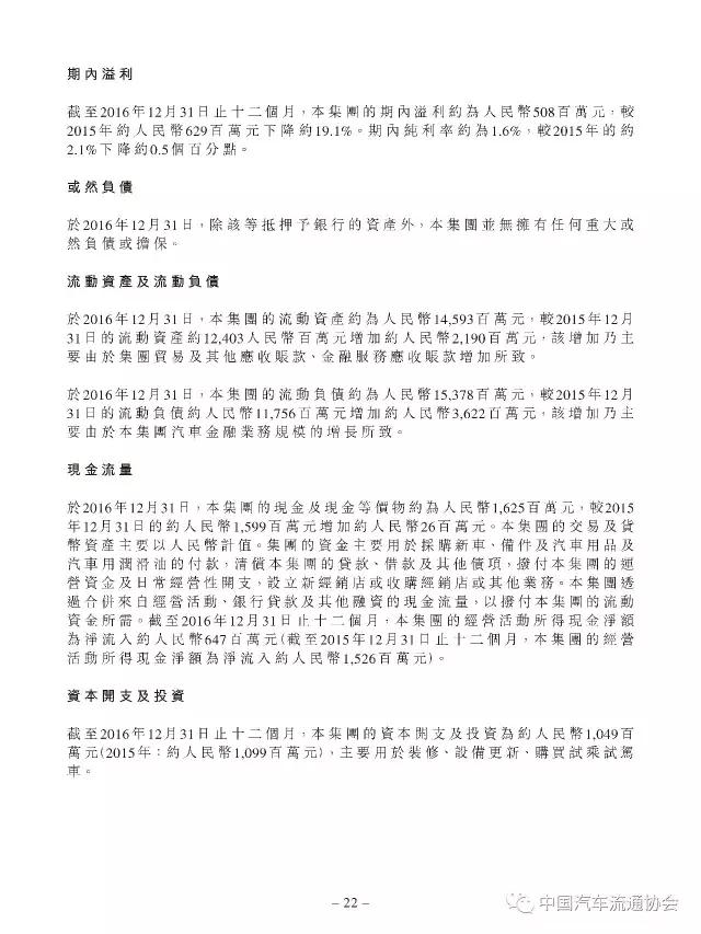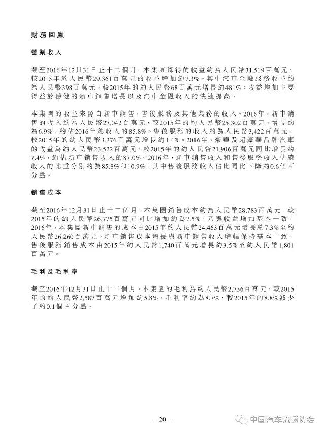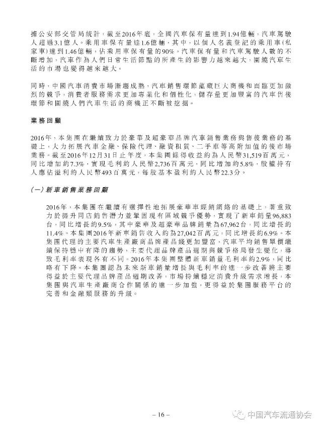 2016年度正通汽车实现新车销量96883台,同比增长9.5%;总收入315.2亿元人民币(货币单位下同),较上年同比增长7.3%;整体毛利27.4亿元,同比增长5.8%;金融服务业务所得利息及服务收入4亿元,实现利润2.2亿元;集团年内实现净利润5.1亿元,同比下降19.1%。
