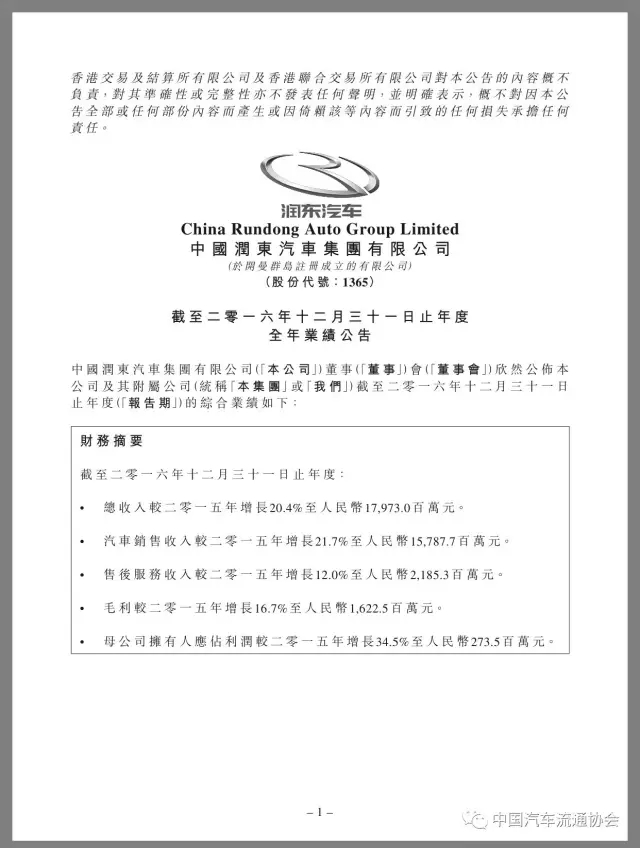 百强汽车经销商集团“润东汽车”2016年度经营业绩公布
