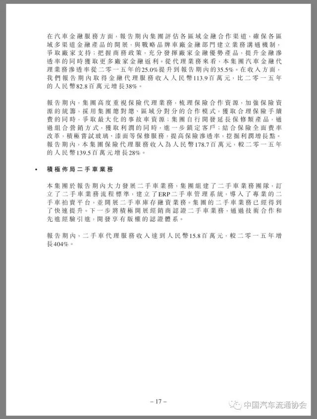 润东汽车于报告期内大力发展二手车业务,组建了二手车业务团队,订立了二手车业务流程标准,建立了ERP二手车管理系统,导入了专业的二手车拍卖平台,并开展二手车库存融资业务,使二手车业务得到了快速提升。2016年度,润东汽车二手车代理服务收入达1580万元,同比大幅增长了404%。