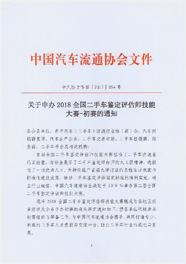 关于申办2018全国二手车鉴定评估师技能大赛-初赛的通知
