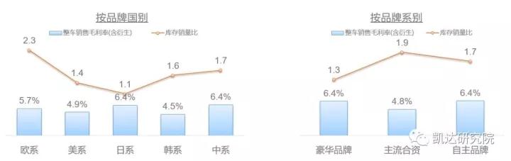 从品牌综合盈利能力来看,日系和欧系具有相对优势,税前利润率分别为3.7%和3.1%;中系品牌表现相对较差(0.9%);按品牌级别来看,豪华品牌占据绝对优势,税前利润率达到4.0%。