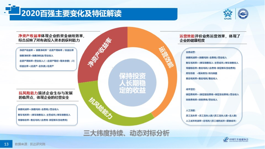 为协助更多企业完成由强向优的转型升级,2020中国汽车经销商大会在发布百强经销商集团营收榜单的基础上,突破性地为所有经销商集团、经销商单店提供三大对标服务:净资产收益率对标、抗风险能力对标、运营效能对标。通过建立完善的对标体系,促进厂商关系平衡,助力经销商集团提升服务运营能力,进而提升整体发展水平。