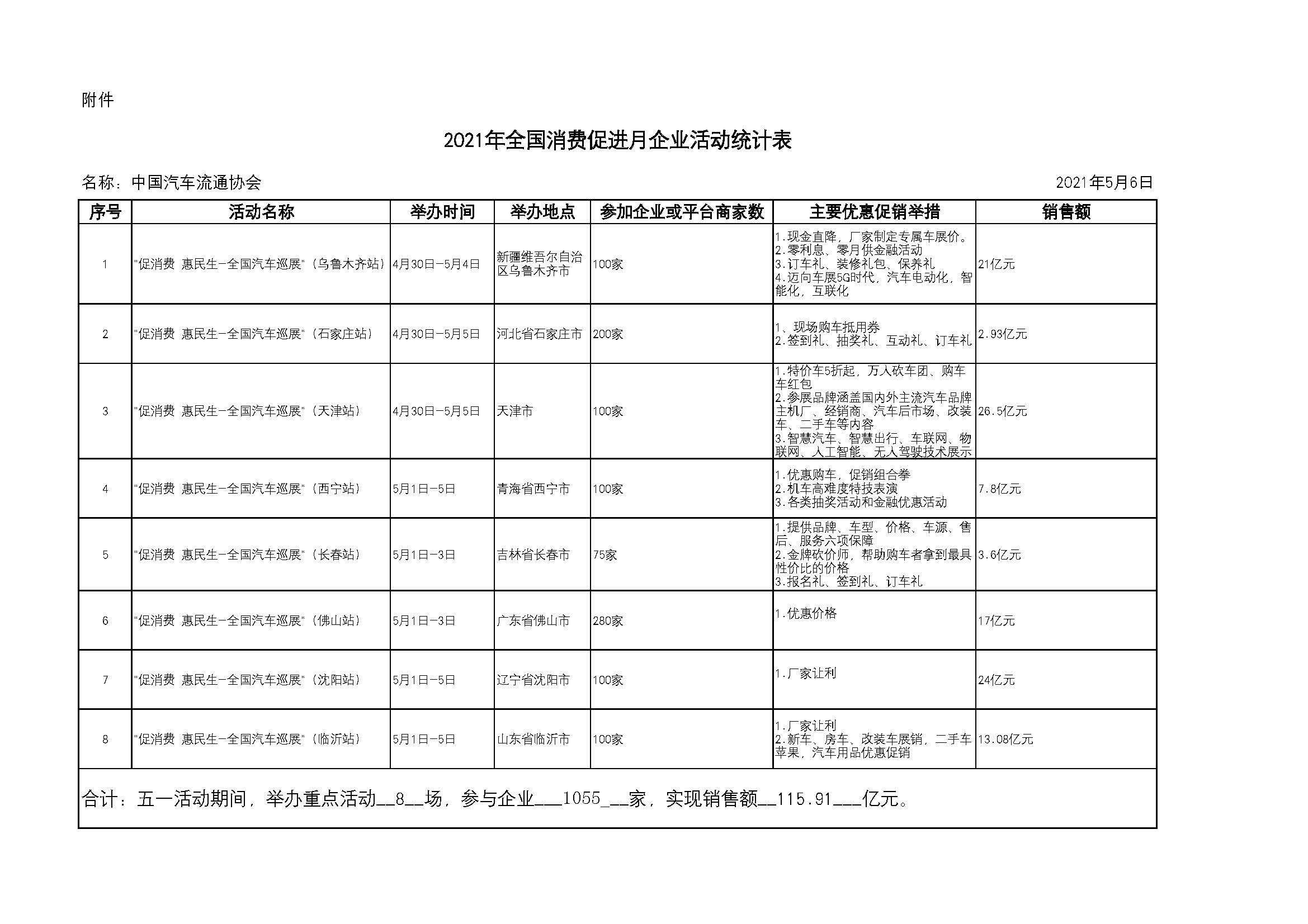 在商务部指导下,配合消费促进月活动的开展,中国汽车流通协会联合各地政府和相关会员单位,共同举办“费 惠民生-全国汽车巡展”系列活动,五一期间已成功举办八期:乌鲁木齐站,石家庄站,天津站,西宁站,长春站,佛山站,沈阳站,临沂站,八场共实现销售额115.91亿元。销售量80369辆,参与企业1055家,具体情况后附。