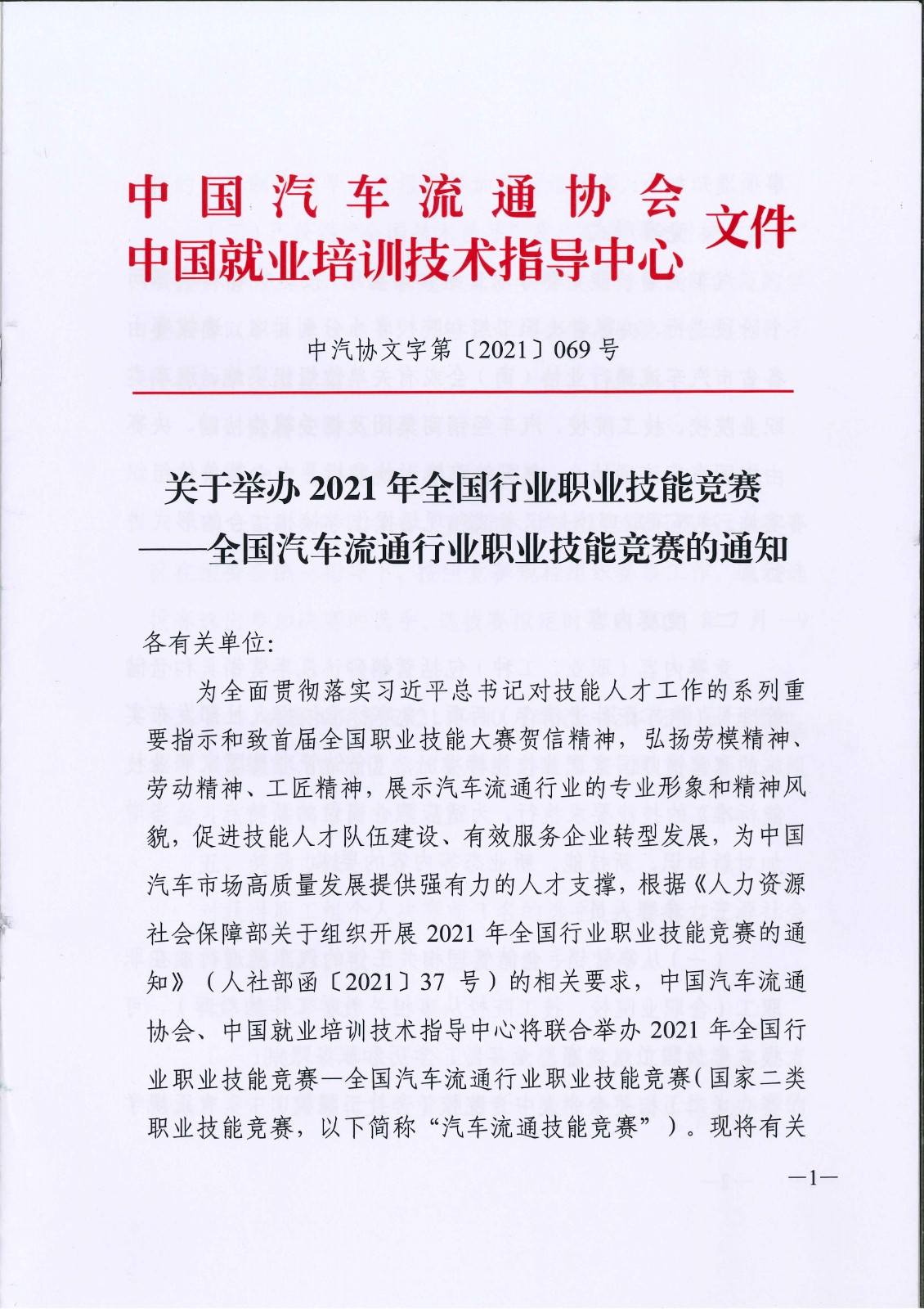 关于举办2021年全国行业职业技能竞赛——全国汽车流通行业职业技能竞赛的通知