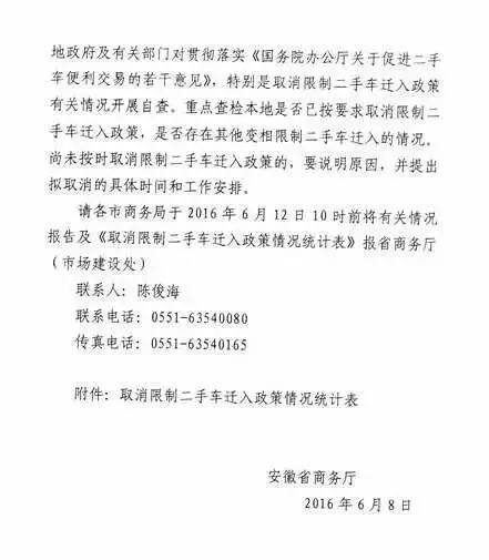 近日,安徽省商务厅发出通知要求,各地商务部门积极配合当地政府及有关部门,对贯彻落实国务院办公厅促进二手车便利交易的若干意见,特别是取消限制二手车迁入政策有关情况开展自查,重点检查本地是否已按要求取消限制二手车迁入政策,是否存在其他变相限制二手车迁入的情况。尚未按时取消限制二手车迁入政策的,要说明原因,并提出拟取消的具体时间和工作安排。