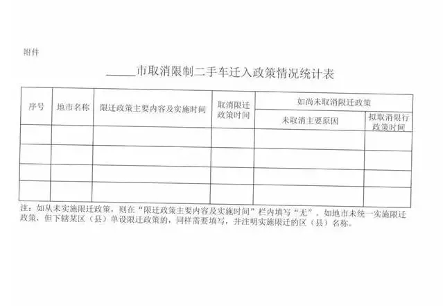 促进二手车便利交易的若干意见明确要求,各地不得制定实施限制二手车迁入政策。符合国家在用机动车排放和安全标准,在环保定期检验有效期和年检有效期内的二手车均可办理迁入手续。但国家鼓励淘汰和要求淘汰的相关车辆,以及国家明确的大气污染防治重点区域有特殊要求的除外。已经实施限制二手车迁入政策的地方,要在2016年5月底前予以取消。