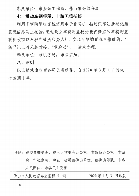 1.推动汽车更新换代。佛山号牌车主凭旧车售卖发票或汽车报废注销证明购买新车,每辆给予3000元补助。