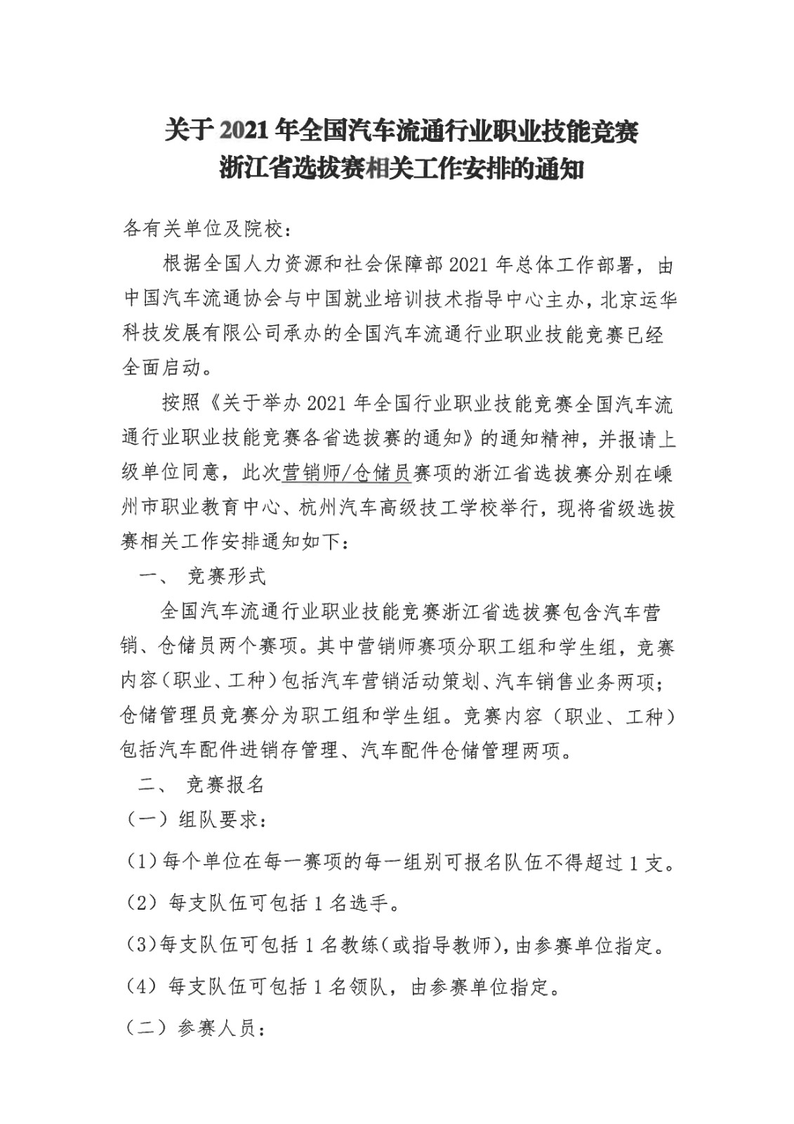 关于2021年全国汽车流通行业职业技能竞赛浙江省选拔赛相关工作安排的通知