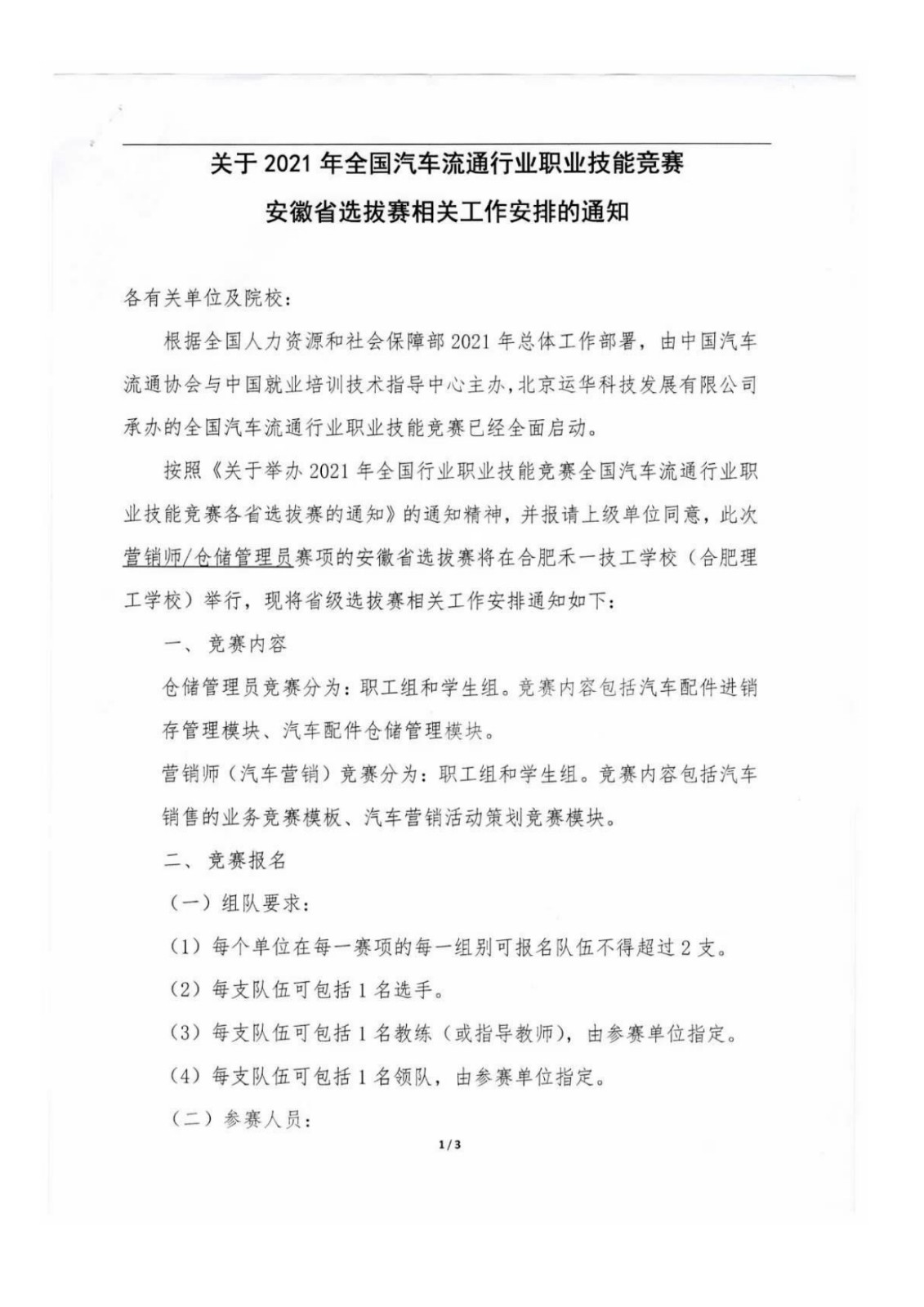 关于2021年全国汽车流通行业职业技能竞赛安徽省选拔赛相关工作安排的通知