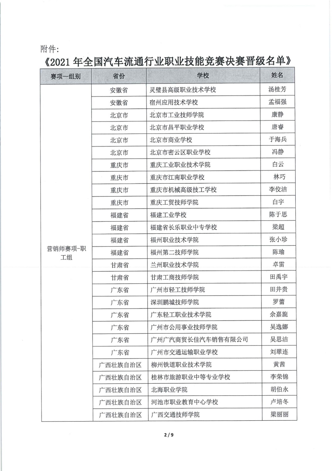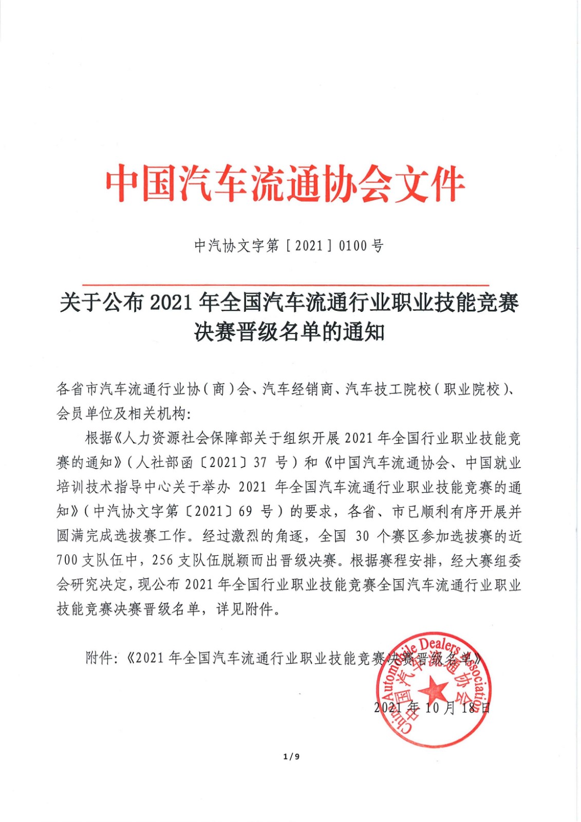 关于公布2021年全国汽车流通行业职业技能竞赛 决赛晋级名单的通知
