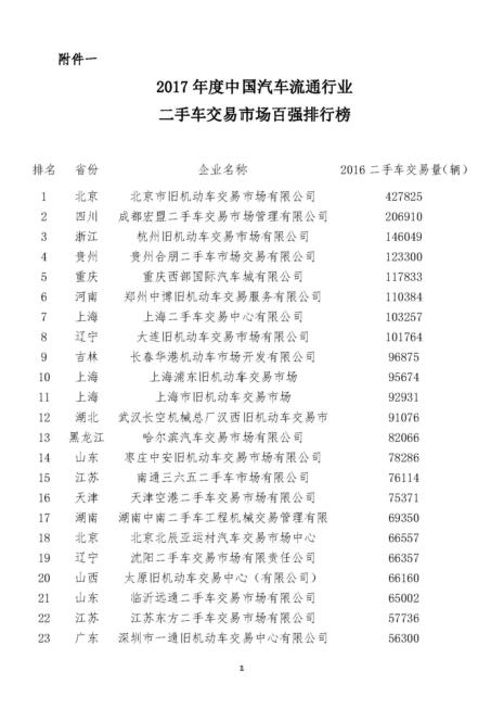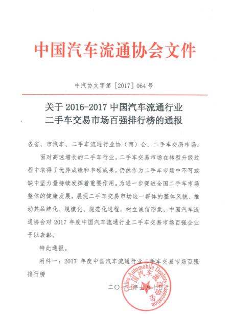 关于2016-2017中国汽车流通行业二手车交易市场百强排行榜的通报