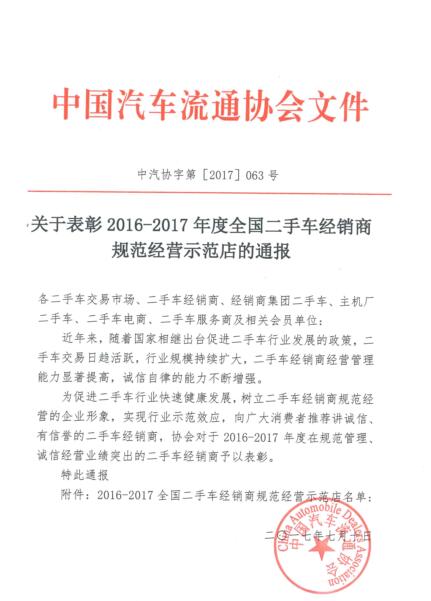 关于表彰2016-2017年度全国二手车经销商规范经营示范店的通报