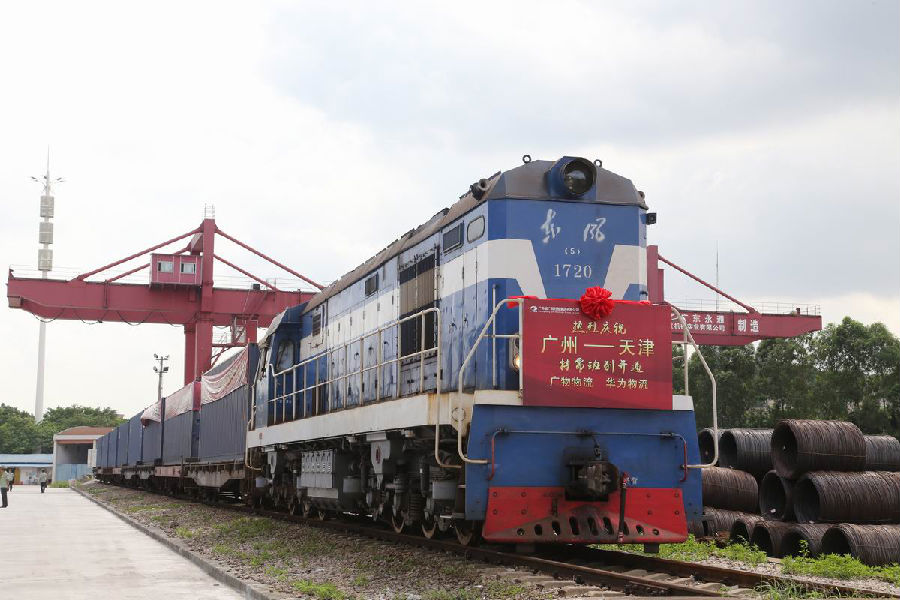 广东(广州)国际铁路经济产业区首列集装箱特需班列缓缓驶出
