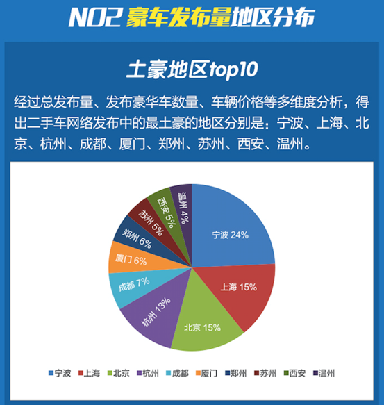 与9月相比,10月豪车发布量城市前三名无变化,一直以来都是被宁波、上海、北京承包。10个城市中,绝大部分为南方城市,可见南方豪车数量相比北方城市较多。这与各地的经济水平有直接关系。